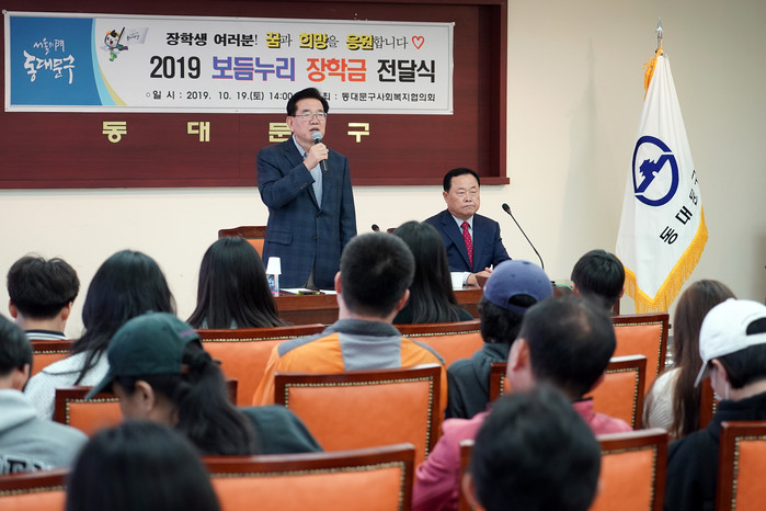 최근 유덕열 서울 동대문구청장이 구청 5층 기획상황실에서 열린 ‘보듬누리 중·고생 장학금 전달식’에 참석해 학생들을 격려했다. 사진은 격려사를 하고 있는 유 구청장의 모습. (사진제공=동대문구청)