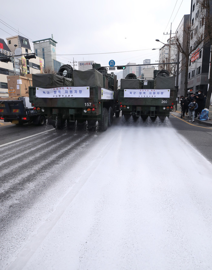 4일 오전 은평구 역촌역 인근 도로에서 수도방위사령부 제독차량이 신종 코로나 바이러스 감염증(코로나19) 관련 방역 작업을 하고 있다.