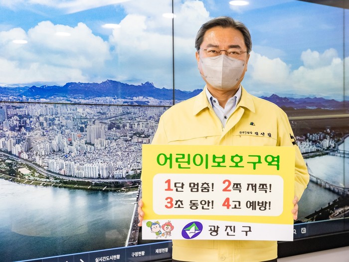 김선갑 서울 광진구청장이 8일 어린이 보호구역내 교통안전에 대한 사회적 관심과 공감대 형성을 위한 ‘어린이 교통안전 릴레이 챌린지’에 동참했다. 사진은 김 구청장이 ‘어린이 교통안전 릴레이 챌린지’에 참여하고 있는 모습. (사진제공=광진구청)