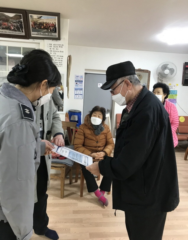 인천 서구가 최근 서부경찰서와 합동으로 지역내 총 12곳의 공공경로당에서 만 65세 이상 노인 529명을 대상으로 3회에 걸쳐 '찾아가는 어르신 교통안전교육'을 실시했다. 이 교육은 지속적으로 발생하고 있는 만 65세 이상 노인 교통사고를 줄이기 위해 마련됐다. 사진은 경찰관이 노인들에게 교통안전 홍보물품을 배부하고 있는 모습. (사진제공=서구청)