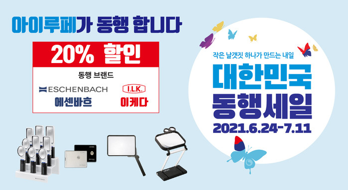 이곳은 지난 4월, 한경비지니스가 주최하는 2021년 대한민국소비자만족대상에서 ‘저시력용품’ 고객만족브랜드 부문에 선정된 바 있다. 이번 동행 세일에서 아이루페는 독일 명품 확대경 에센바흐(Eschenbach Optik GmbH)와 일본의 이케다(I.L.K)의 고급 확대경을 20% 할인한 가격에 선보일 예정이다.