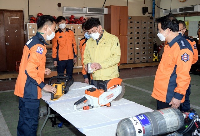 | ▲ 김종효 광주광역시 행정부시장이 4일 오후 설 명절 대비 화정119 안전센터를 방문해 근무중인 직원들을 격려하고 소방장비를 점검하고 있다./광주광역시 제공 |
