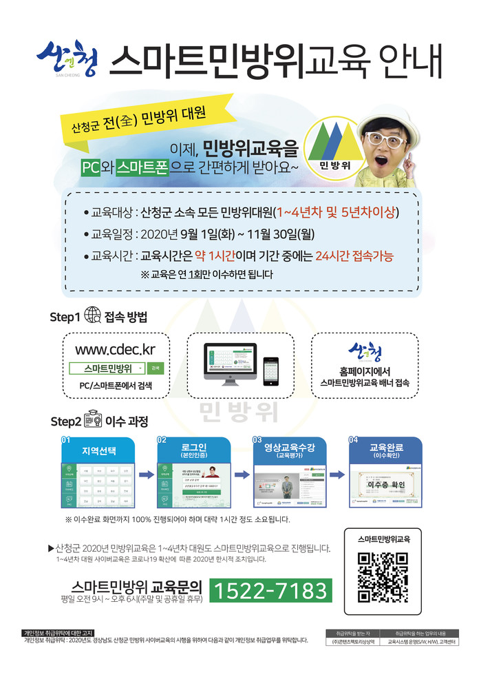 산청군 민방위 대원은 9월1일부터 11월30일까지 스마트민방위교육 홈페이지(스마트민방위교육 www.cdec.kr)에서 본인인증을 통해 로그인을 하면 교육이 가능하다. 스마트폰과 PC를 통해 교육 받을 수 있고 영상 시청 후 이수증을 확인하면 된다.