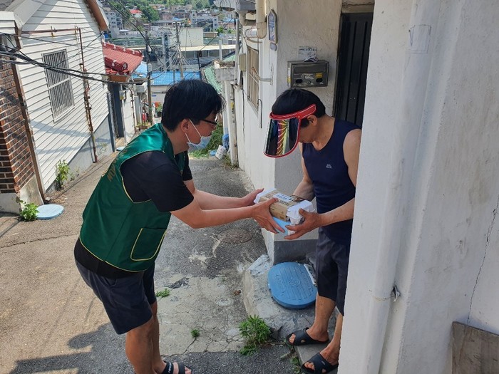 경기 구리시는 지난 14일 지역내 봉사단체인 구리상록회와 함께 구리시정신건강복지센터 회원 가운데 저소득층 40여가구에 계란 30구씩을 전달했다. 사진은 구리상록회 회원이 직접 대상 가구를 방문해 계란을 전달하고 있는 모습. (사진제공=구리시청)