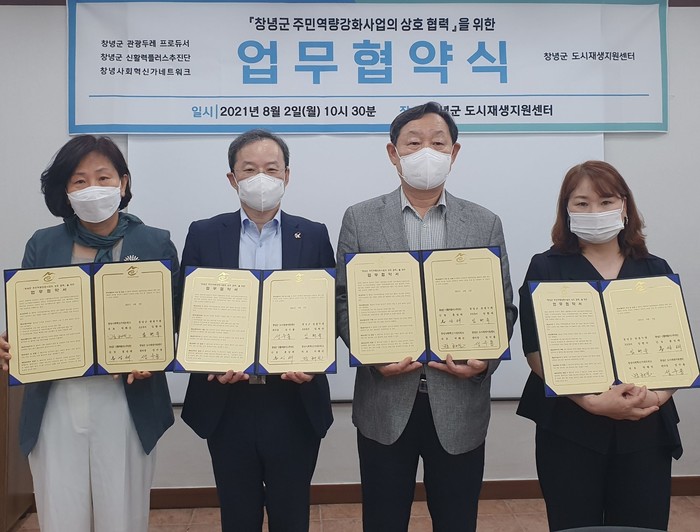 창녕군(군수 한정우)은 2일 창녕군 도시재생지원센터 회의실에서 창녕군 도시재생지원센터(센터장 성수용)와 창녕군 관광두레(프로듀서 임현숙), 창녕군 신활력플러스추진단(단장 홍성태), 창녕사회혁신가네트워크(대표 박해진) 간 ‘도시재생 뉴딜사업 추진을 위한 업무협약’을 체결했다.