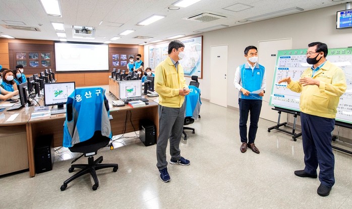 성장현 용산구청장이 지난 7일 구 재난안전대책본부(재대본)를 찾아 상황실 운영실태를 살피고 근무자를 격려했다. 사진은 성 구청장(오른쪽)이 재대본을 방문해 연일 비상근무를 하고 있는 직원들과 대화를 나누고 있는 모습. (사진제공=용산구청)