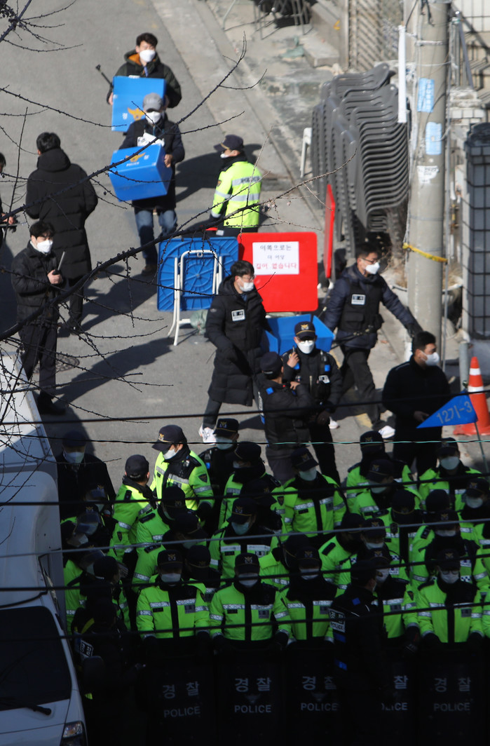 1일 오후 서울 성북구 사랑제일교회에서 압수수색을 마친 경찰이 물품을 옮기고 있다. 경찰은 지난달 명도집행 과정에서 일부 관계자들이 화염병을 동원한 일 등 불법행위를 수사하기 위해 교회 본관과 별관 등에 대한 압수수색에 나섰다.