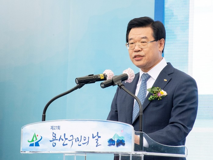 성장현 서울 용산구청장이 지난 16일 용산공원 개방부지에서 열린 ‘제27회 용산구민의 날 기념식’에 참석했다. 구는 비대면 형태로 행사를 진행, 참석인원을 최소화했으며 행사 전과정을 유튜브로 생중계했다. 사진은 이날 성 구청장이 기념사를 하고 있는 모습. (사진제공=용산구청)