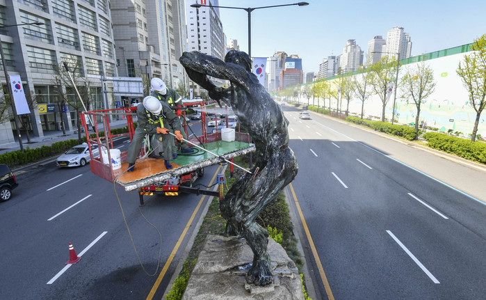 8일 오전 서울 송파구 관계자들이 올림픽공원 옆 도로에 설치된 올림픽 상징 조형물을 청소하고 있다.