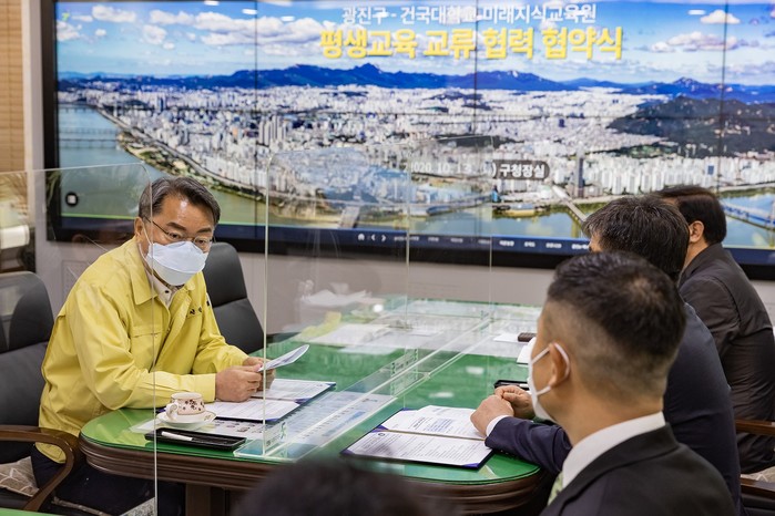 서울 광진구가 지난 13일 건국대학교 미래지식교육원과 지역의 평생교육 활성화를 위한 ‘평생교육 교류협력 협약’을 체결했다. 주요 협약 내용은 대학과 지역사회를 연계한 다양한 평생학습 프로그램 개발 및 운영 등이다. 사진은 협약식에서 김선갑 구청장(왼쪽)이 관계자들과 대화를 하는 모습. (사진제공=광진구청)