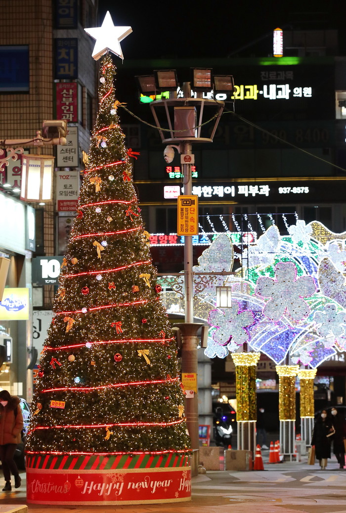 14일 오후 서울 노원구 문화의거리에 크리스마스 시즌을 맞아 설치된 조형물 사이로 시민들이 길을 걷고 있다.
