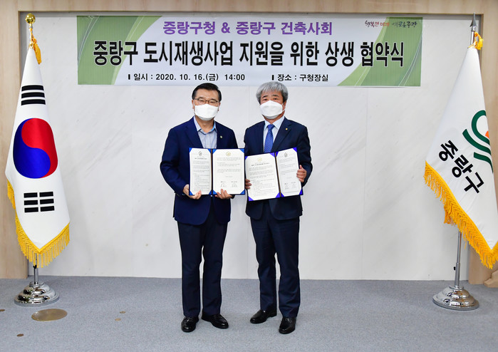 서울 중랑구가 지난 16일 중랑구 건축사회와 ‘중랑구 도시재생활성화를 위한 협약’을 체결했다. 이 협약은 ‘공공·건축사·주민’의 협력체계를 확보해 현장밀착형 도시재생사업을 추진하고 노후주택밀집지역의 주거환경 개선사업을 진행하기 위해 마련됐다. 사진은 협약식에서 류경기 구청장(왼쪽)과 정영호 건축사회회장이 기념촬영을 하고 있는 모습. (사진제공=중랑구청)