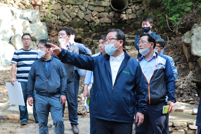 조광한 경기 남양주시장이 주요사업 추진현황과 와부 한강변 일대에 출몰해 주민불편을 초래하는 동양하루살이 퇴치현황 점검을 위한 현장 확인에 나섰다. 사진은 조 시장(가운데)이 관계 공무원들과 청학천 정원화사업 현장을 점검하고 있는 모습. (사진제공=남양주시청)