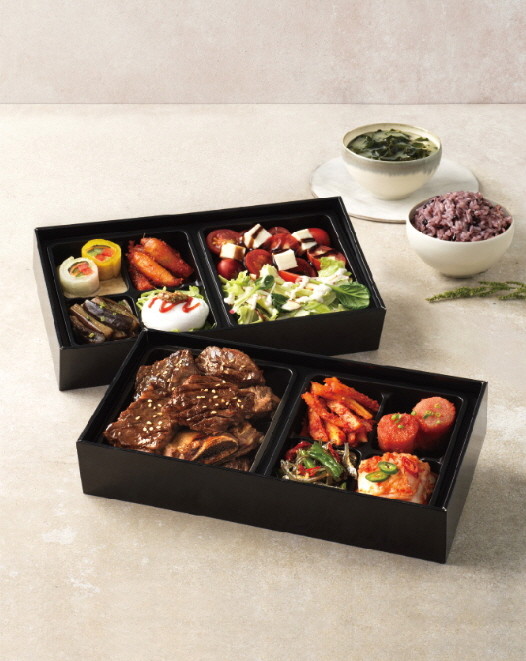 프리미엄 양념 소갈비 도시락은 창고43 고기 품질을 그대로 적용한 양념 소갈비를 메인으로 꽈리고추 멸치볶음, 명란젓 더덕무침 등 반찬 6종에 샐러드 2종, 미역국, 흑미밥으로 구성된 메뉴다.