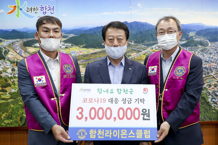 이날 합천라이온스클럽회장 이·취임식에 앞서 군청을 방문한 회장단은 문준희 군수에게 코로나19 성금 300만원을 전달했다.