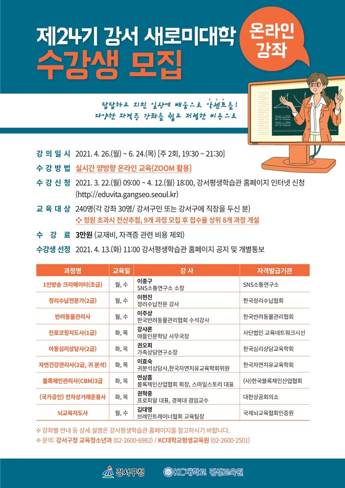 자세한 문의는 KC대학교 평생교육원이나 강서구청 교육청소년과로 하면 된다.