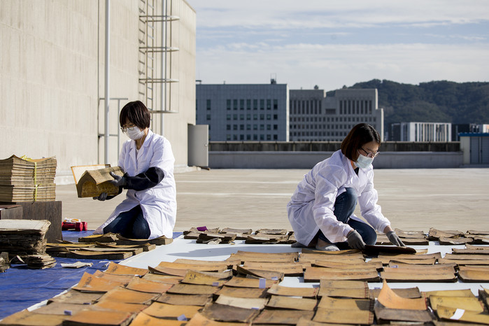 7일 국립중앙도서관 고문헌과 학예연구사들이 서초구에 위치한 본관에서 책 등의 습기를 햇볕과 바람에 말리는 '기증 고문헌 포쇄작업'을 진행했다. 사진은 책의 먼지를 털며 포쇄작업을 하고 있는 연구사들의 모습. (사진제공=국립중앙도서관)