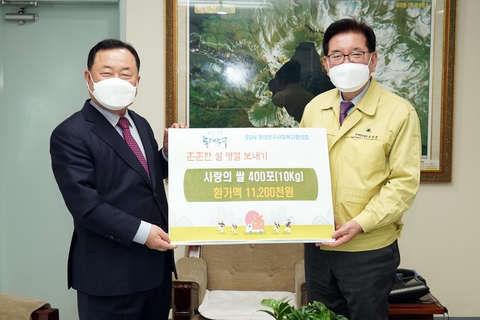 서울 동대문구는 2일 동대문구사회복지협의회로부터 설을 맞아 어려운 이웃을 위한 사랑의 쌀(상주 삼백쌀 10kg 400포·환가액 1120만원)을 전달받았다. 사진은 전달식에서 유덕열 구청장(오른쪽)이 박상종 회장과 기념촬영을 하는 모습. (사진제공=동대문구청)
