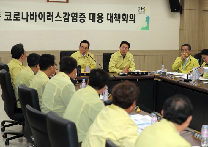 정순균 서울 강남구청장이 오늘 오전 9시에 강남구청 4층 회의실에서 신종 코로나바이러스 감염증에 대응하기 위한 대책 회의를 개최했다. 이날 회의에서는 신종 코로나바이러스 감염증 관리 현황 및 현재 강남구에 있는 외국인 관광객 관련 대응 사항을 논의하고 지역내 노인·어린이 등 감염증에 취약한 구민들을 위한 적극적인 예방 활동을 독려했다. 사진은 회의 진행 모습.(사진제공=강남구청)
