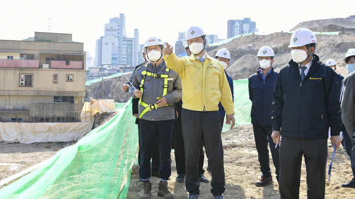 서울 서대문구는 8일 홍은2구역 주택재건축 공사현장에서 해빙기 민·관합동 안전점검을 실시해 흙막이 시설 변형, 주변 구조물 균열, 배수시설 이상 여부 등을 점검했다. 사진은 문석진 구청장(앞줄 왼쪽에서 두 번째)이 관계자들과 현장을 살펴보고 있는 모습. (사진제공=서대문구청)