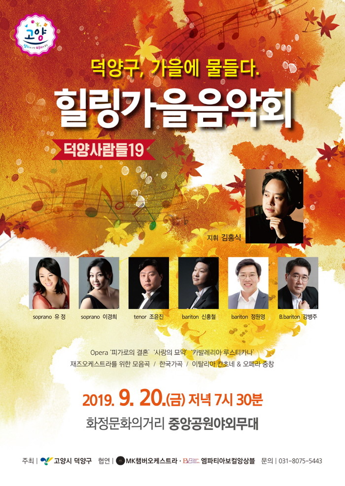 [고양=이기홍 기자] 고양시 덕양구가 주최하는 힐링가을음악회 ‘덕양사람들19’가 오는 20일오후 7시 30분 화정중앙공원 야외무대에서 열린다.