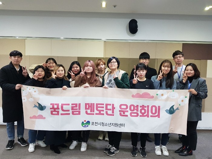 경기 포천시 학교밖청소년지원센터는 최근 포천청소년교육문화센터 자치기구실에서 학교밖 청소년 지원을 위한 ‘제5기 꿈드림 멘토단’ 면접 및 사전교육, 운영회의 등을 했다. 사진은 꿈드림 멘토단 회의에 참석한 청소년들이 기념촬영을 하는 모습. (사진제공=포천시청)