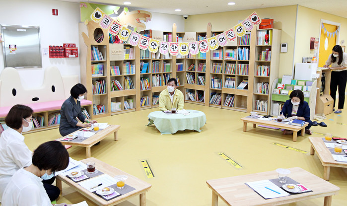 | 이창우 동작구청장이 사회적 거리두기 2단계 격상에 따라 긴급 돌봄이 시행되고 있는 구립흑석어린이집을 방문해 어린이집 관계자에게 철저한 방역수칙 준수를 당부하고 있다. |