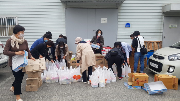 충남 아산시 온양5동 여성자원봉사단이 지난 16일 지역내 저소득 취약계층 44가구에 직접 방문해 식생활 용품을 전달했다. 또 난방시설 등의 생활환경을 살펴보면서 안부확인도 실시했다. 사진은 여성자원봉사단원들이 식생활용품 나눔을 위한 준비작업을 하고 있는 모습. (사진제공=아산시청)
