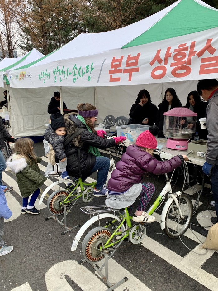 경기 수원시 영통구 영통1동은 최근 황곡초교삼거리부터 황골공원에 이르는 도로에서 2019 마지막 차 없는 거리 '겨울이야기' 행사를 개최했다. 사진은 행사에 참여한 주민들이 자전거발전기로 솜사탕을 만들고 있는 모습. (사진제공=영통구청)