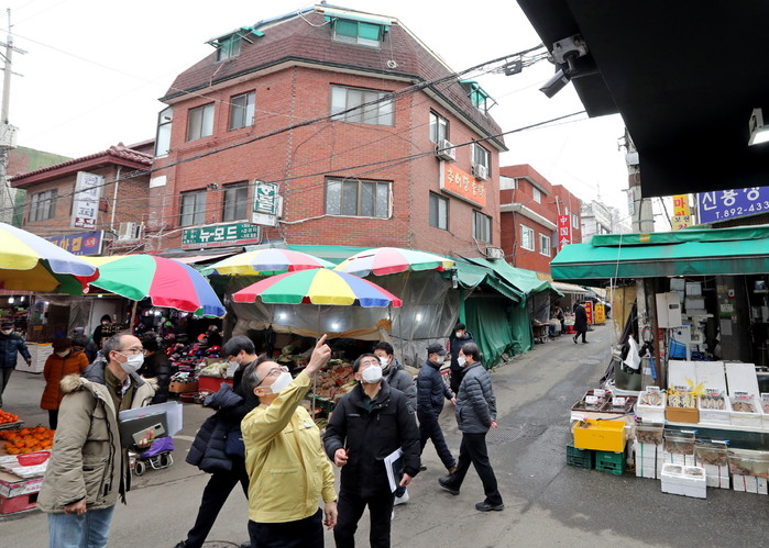 유성훈 서울 금천구청장이 21일 시흥1동에 위치한 현대시장과 대명시장을 방문해 겨울철 화재예방시설을 점검하고, 코로나19로 어려움을 겪고 있는 상인들의 애로사항을 청취했다. 사진은 유 구청장이 전통시장 공용구간에 설치된 불꽃감지기를 점검하고 있는 모습. (사진제공=금천구청)