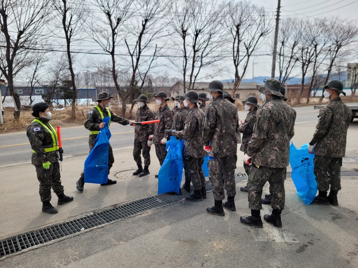 경기 포천시 동교동에 주둔하고 있는 606수송대대는 최근 봄맞이 환경정화 대청소를 실시해 선단동에서 양주로 넘어가는 약 2.5km와 동교사거리에서 소흘읍 방향 800m 도로변 구간을 청소했다. 사진은 이날 병사들이 도로변에 무단투기된 쓰레기를 수거하고 있는 모습. (사진제공=포천시청)