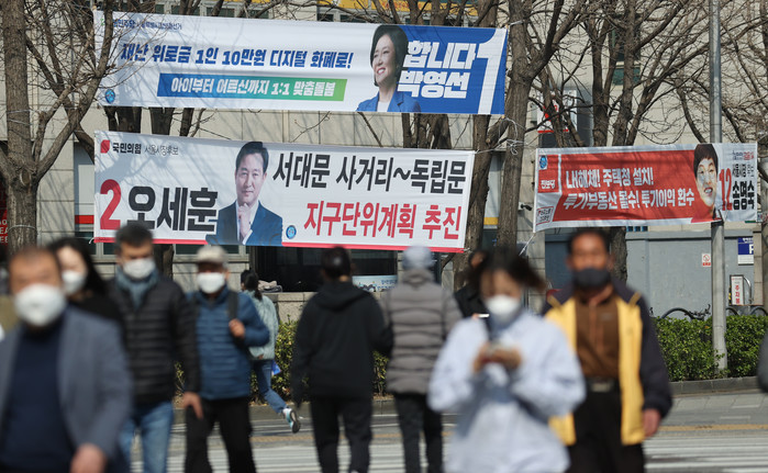 4.7 보궐선거 공식 선거운동 첫 날인 25일 서울 서대문역 사거리에 서울시장 출마 후보들의 현수막이 걸려 있다.