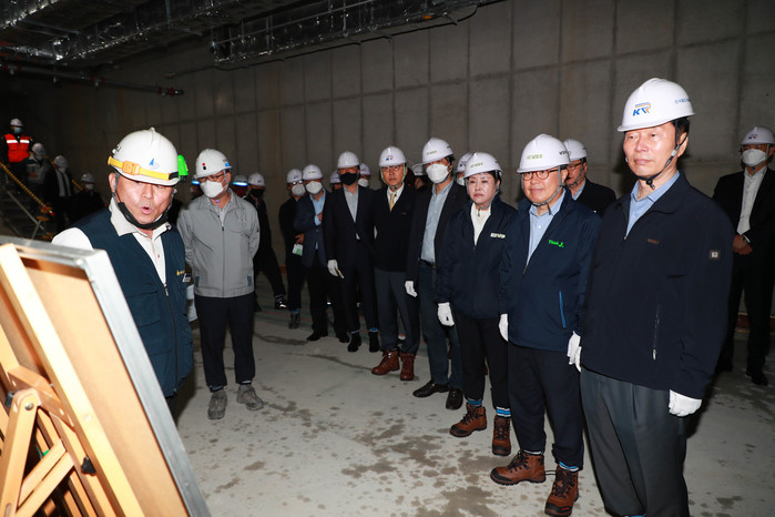 조광한 경기 남양주시장이 12일 진접선 복선전철 건설공사 3공구 오남역 현장을 방문해 진접선 적기 개통을 위한 사업 추진사항 등에 대해 점검하고 관계자들을 격려했다. 사진은 조 시장(오른쪽 두 번째)이 건설현장 관계자의 설명을 듣고 있는 모습. (사진제공=남양주시청)