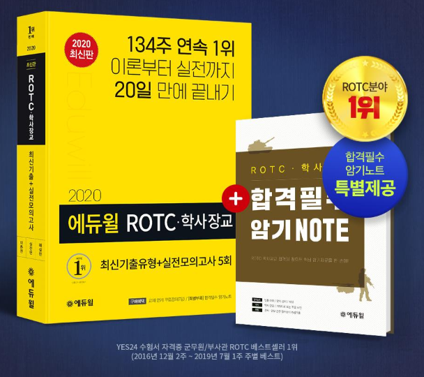 [시민일보 = 여영준 기자] 종합교육기업 에듀윌(대표 박명규)이 발간한 ‘2020 에듀윌 ROTC 학사장교 최신기출유형+실전모의고사 5회’ 교재가 온라인서점 YES24의 ROTC 부문 6월 5주차 베스트셀러 1위를 차지했다.