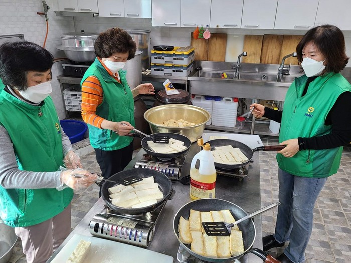 경기 수원시 영통구 매탄1동 새마을부녀회는 8일 코로나 장기화로 인해 침체된 골목상권을 살리고 지역내 어려운 이웃에게 따듯한 마음을 전하고자 ‘2021 사랑의 반찬 나누기’ 행사를 진행했다. 이날 매탄1동 새마을부녀회는 소외계층 30가구에 돼지불고기, 두부조림, 시래기나물 등 정성을 담아 밑반찬을 조리하고 포장해 이웃에게 전달했다. 사진은 관계자들이 음식을 만들고 있는 모습. (사진제공=영통구청)