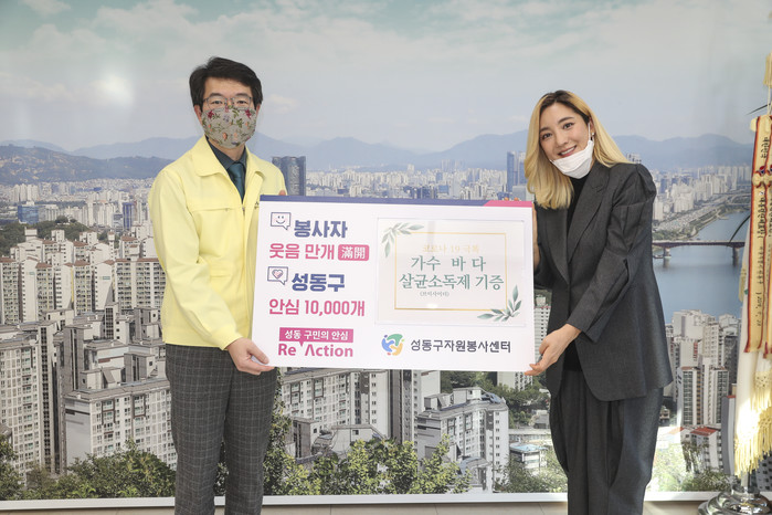 서울 성동구는 최근 가수 '바다'로부터 코로나19 극복을 위한 살균소독제 1000개(1200만원 상당)를 기탁받았다. 기탁된 살균소독제는 성동구 전역에 대한 방역활동에 쓰일 예정이다. 사진은 정원오 구청장(왼쪽)과 바다가 기념촬영을 하는 모습. (사진제공=성동구청)