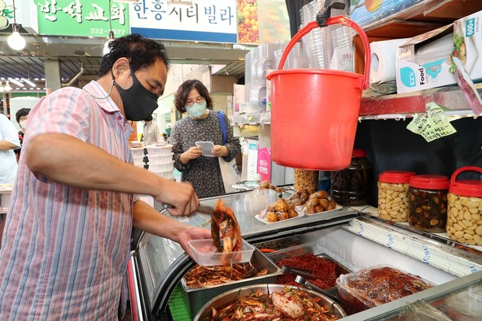 서울 마포구 망원동월드컵시장이 최근 ‘용기내! 망원동월드컵시장’ 선포식을 개최했다. 용기내! 캠페인은 ‘용기(勇氣)를 내서, 용기(容器)를 내자’는 의미로 식재료나 음식을 포장할 때 다회용기를 사용하자는 운동이다. 사진은 이날 망원동월드컵시장에서 다회용기로 장보기 시연 중인 모습.(사진제공=마포구청)