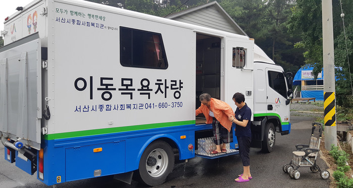 충남 서산시종합사회복지관이 복지사각지대 해소와 주민 만족도 제고를 위해 이동목욕, 이동세탁 서비스를 추진한다. 복지관은 홀몸노인, 장애인 등 취약계층 240명을 선정해 서비스를 제공하고 있다. 사진은 23일 한 노인이 이동목욕 차량을 이용하는 모습. (사진제공=서산시청)