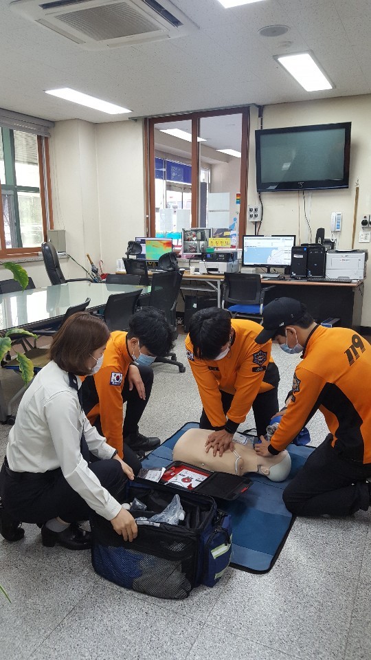 이번 교육은 심폐소생술 및 자동심장충격기 사용법 등 중증응급환자에게 적절한 응급처치를 제공하는 방법 위주로 진행됐다.