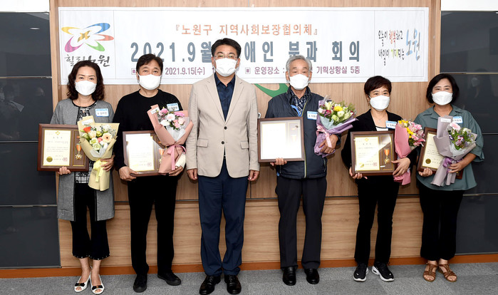 서울 노원구는 지난 15일 제22회 사회복지의 날 표창 수여를 추진해 지역 사회복지를 위해 노력한 총 15명(이웃돌봄부문 5명, 민관협력부문 10명)의 유공자에게 표창을 수여했다. 사진은 수여식에서 오승록 구청장(왼쪽에서 세 번째)이 수상자들과 기념촬영을 하는 모습.(사진제공=노원구청)
