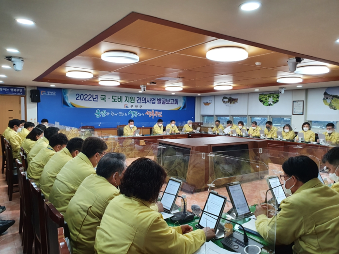 전남 무안군(군수 김산)이 2022년 국.도비 확보를 위해 총력을 기울이고 있다. 군에 따르면, 지난 15일 군청 상황실에서 김산 무안군수를 비롯해 국실과소장 등이 참석한 가운데 2022년 제2차 국.도비 지원 건의사업 발굴보고회를 가졌다고 밝혔다.