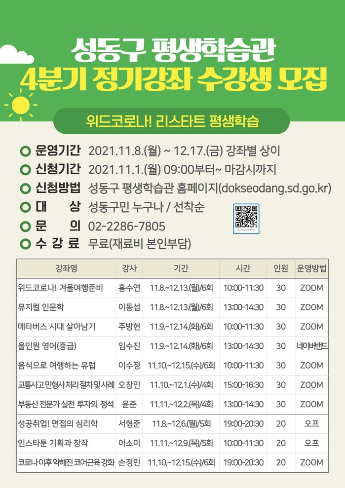 | ▲ 평생학습관 4분기 정기강좌 수강생 모집 안내문. (사진제공=성동구청) |