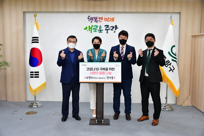 서울 중랑구가 8일 고려대학교 스포츠과학연구소 책임연구원 엄성흠씨로부터 코로나 극복을 위한 KF94 마스크 3000장(대형 1500장·소형 1500장)을 전달받았다. 사진은 전달식에서 (왼쪽부터)류경기 구청장, 중랑구 홍보대사 가수 조엘라, 엄성흠씨가 기념촬영을 하는 모습. (사진제공=중랑구청)