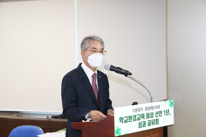경상남도교육청(교육감 박종훈)은 15일 오후 2시 도교육청 제2청사 대회의실에서 기후위기・환경재난시대 『학교환경교육 비상선언 1년, 성과공유회』를 열었다. 이날 행사는 나날이 심각해지는 기후위기와 환경문제에 대한 보다 근본적인 해결을 위해 학교환경교육 비상선언 1주년을 맞아 마련되었다. 행사는 코로나19 상황을 감안하여 대면과 비대면으로 진행하였으며, 기후위기 대응교육 실천교사단 30명은 경남형 미래교육지원플랫폼 ‘아이톡톡’을 활용하여 비대면으로 참석했다.