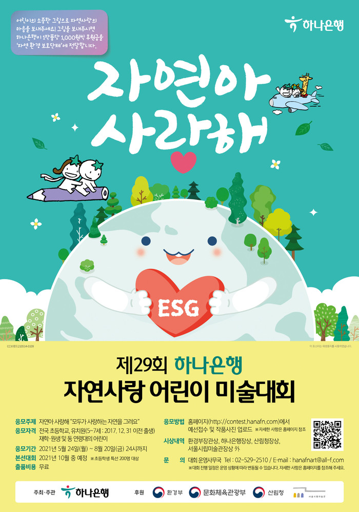 '하나은행 자연사랑 어린이 미술대회'는 환경부, 문화체육관광부, 산림청, 서울시립미술관이 공식 후원하는 국내 최고의 전통을 자랑하는 전국 규모 어린이 미술대회이다.