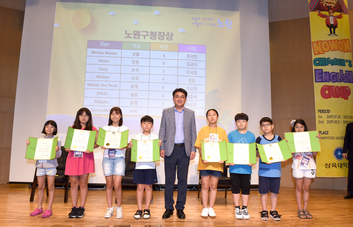 서울 노원구는 20일 삼육대학교 요한관 강당에서 ‘노원 어린이 원어민 영어캠프’ 2차 수료식을 개최했다. 수료식은 우수 학생 시상, 캠프 영상 시청 등으로 진행됐다. 사진은 오승록 구청장(가운데)과 학생들이 기념촬영을 하는 모습. (사진제공=노원구청)