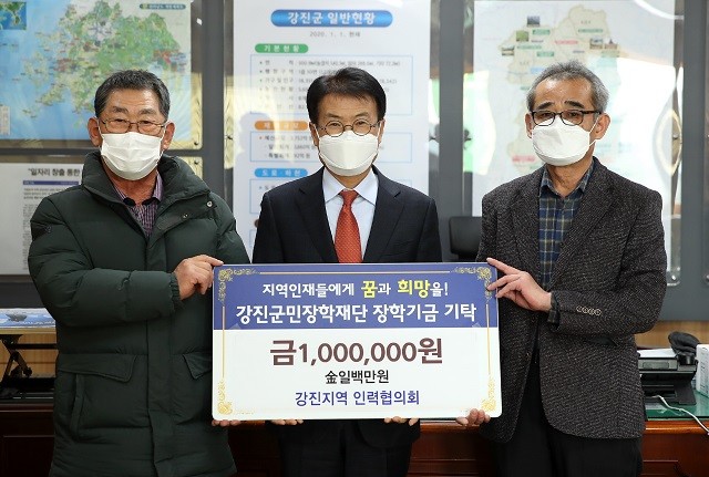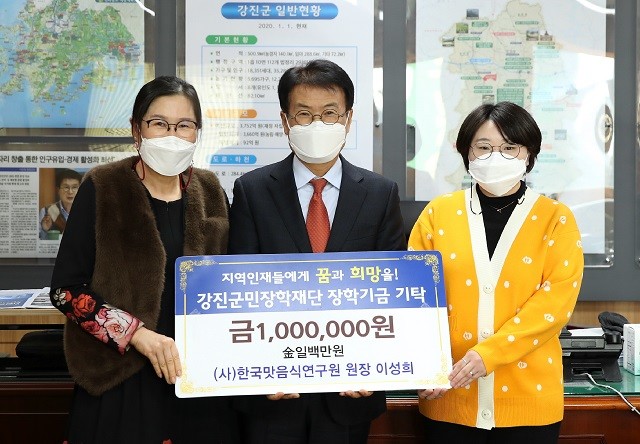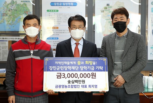 지난 21일 금광영농조합법인 최지영 대표가 300만 원을, 강진지역 인력협의회 신현수 회장, (사)한국맛음식연구원 이성희 원장이 각 100만 원의 장학금을 강진군민장학재단(이사장 이승옥)에 기탁했다.