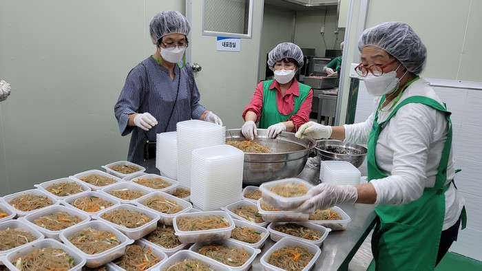 경기 안산시새마을회는 최근 추석을 맞아 '명절음식 나눔 행사'를 열고 지역내 저소득층 및 소년·소녀가장 등 취약계층 150가구에 전달될 잡채·동그랑땡·불고기 등 명절음식을 만들었다. 사진은 이날 회원들이 직접 만든 잡채를 포장하고 있는 모습.(사진제공=안산시청)