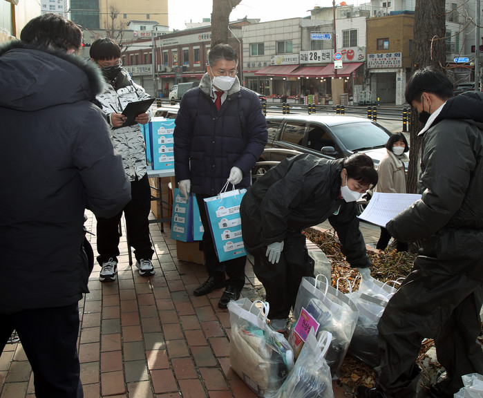 인천 중구는 지난 21일 한파 대책의 일환으로 북성동, 인현동, 경·용·내동 일대 쪽방촌 주민들에게 고급 무릎담요·보온 물주머니를 전달하고, KF94 마스크·손소독제도 함께 지원하면서 코로나19 방역수칙도 안내했다. 사진은 이날 함께한 홍인성 구청장(가운데)이 관계자들과 쪽방촌 주민들에게 전달할 물품을 챙기는 모습. (사진제공=인천 중구청)