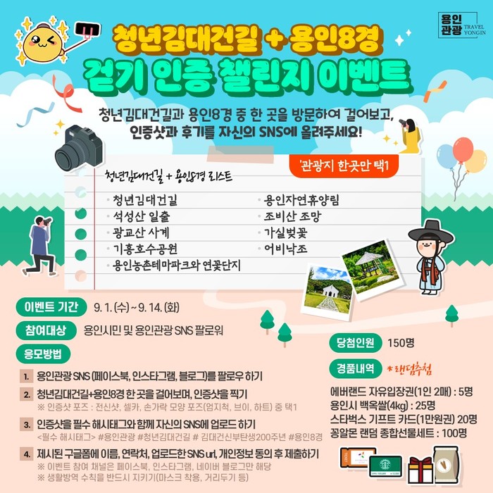 챌린지 참여방법은 먼저 용인관광 공식 페이스북과 인스타그램을 팔로우하거나 네이버 블로그를 이웃추가 한 뒤 청년 김대건길과 용인 8경 중 한 곳을 걸은 후 걷기 인증샷과 필수 해시태그(#용인관광 #청년김대건길 #청년김대건탄생200주년 #용인8경)를 자신의 SNS 계정에 업로드하면 된다.